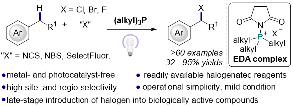 图1. 无金属无光催化剂EDA复合物介导的苄位C–H卤化反应示意图