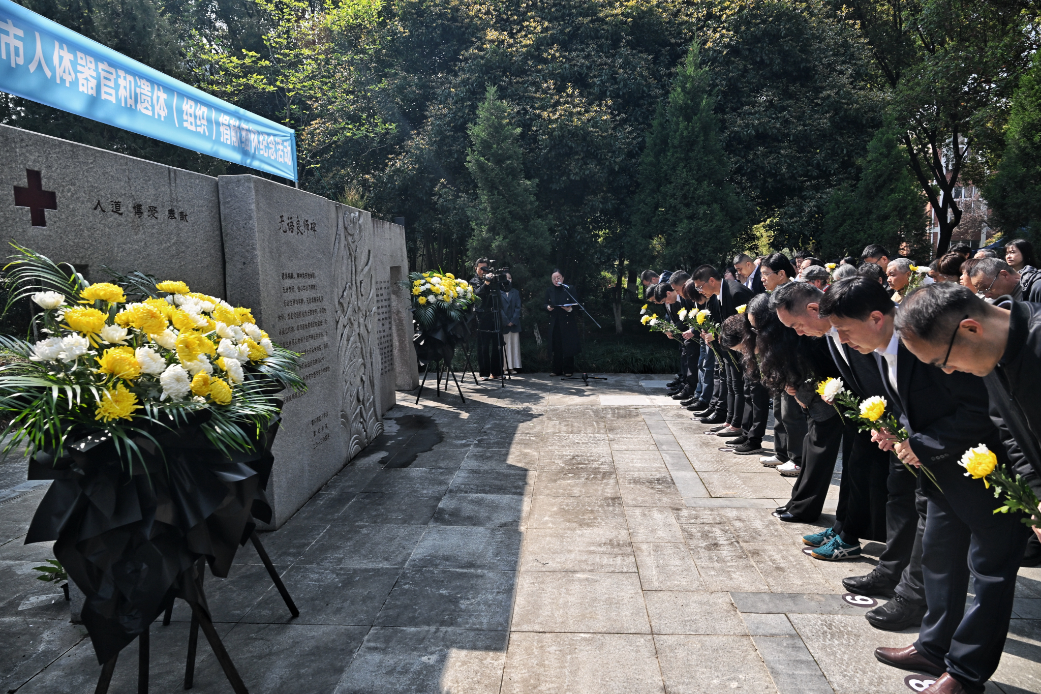 现场庄严肃穆,全体人员面向无语良师碑肃立,向遗体和人体器官捐献者三鞠躬,致以最崇高的敬意与最深切的缅怀。