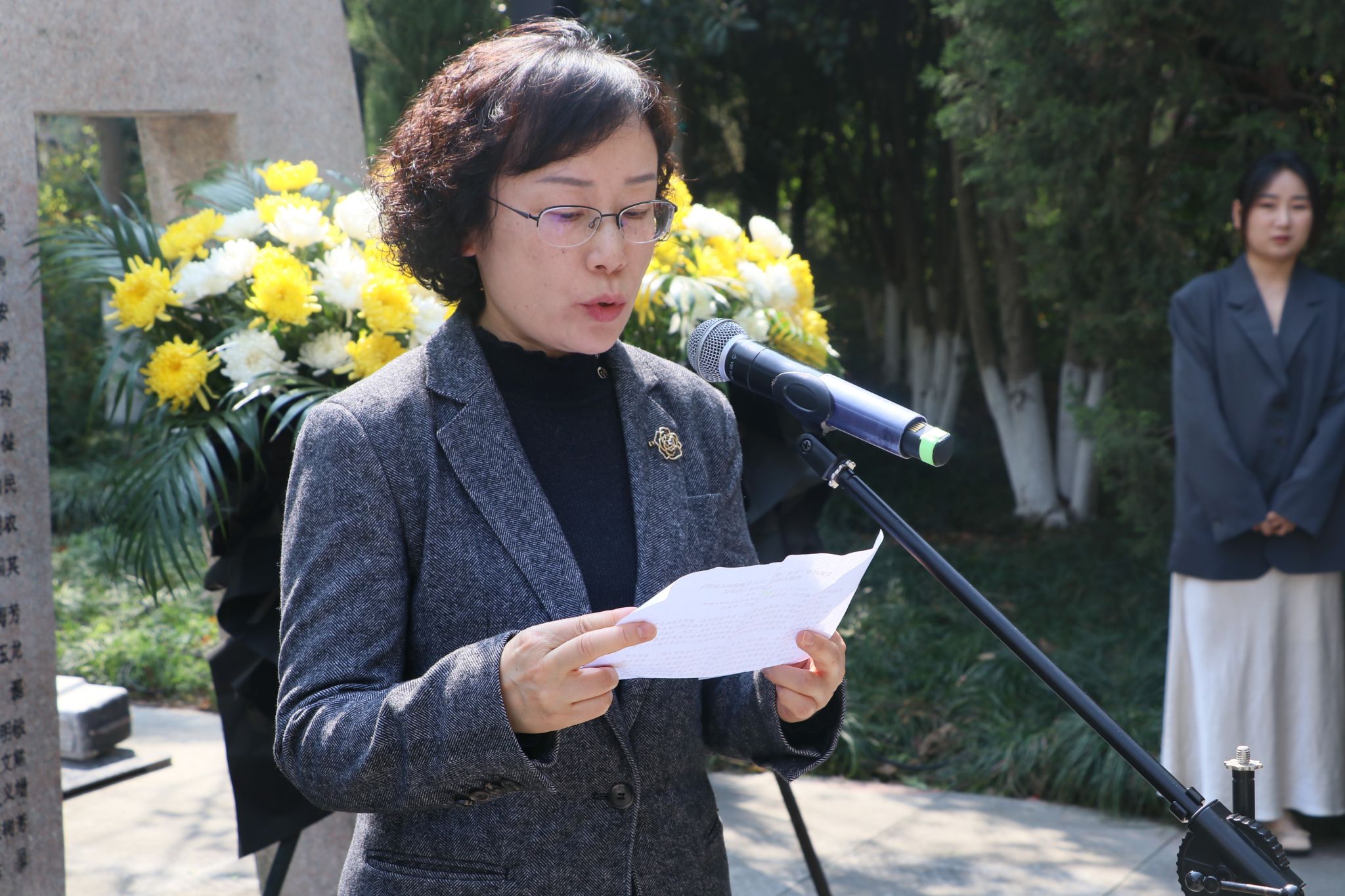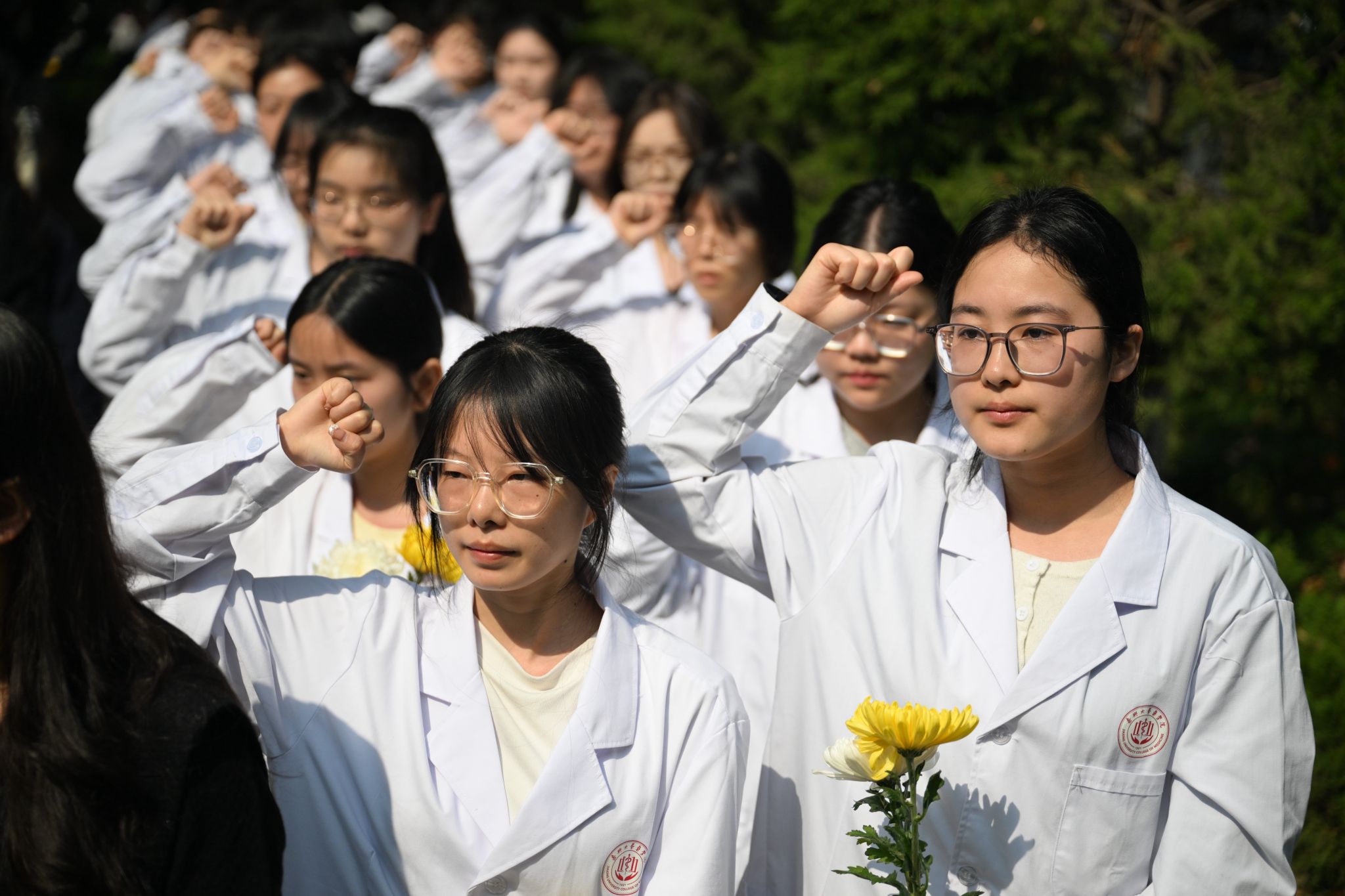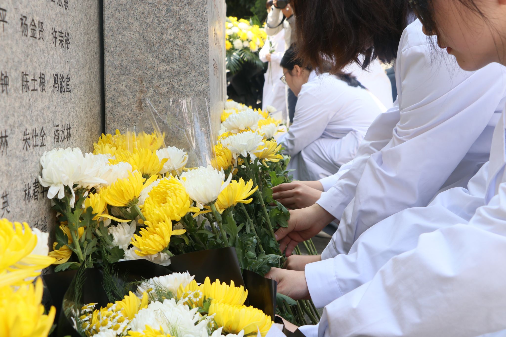 仪式最后,家属代表、领导、师生依次向无语良师碑献花,医学生们将心愿卡挂于碑旁松树上,以青春寄语致敬生命大爱。