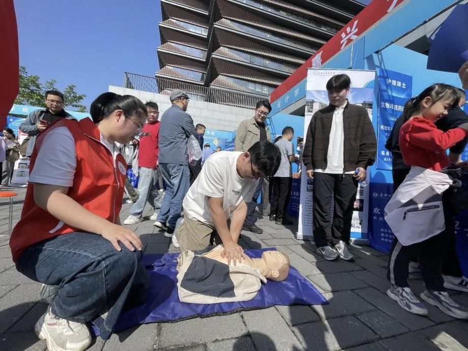 “手臂要伸直,用上半身的力量垂直下压……”在医学专业志愿者手把手的指导下,多位家长和考生轮流上前,在急救模拟人上认真练习起心肺复苏术。边操作边提问,从按压手法、节奏到人工呼吸要领,不少人很快掌握了基本技巧。原本的招生咨询区,转眼化身为一场生动的“迷你急救公开课”。